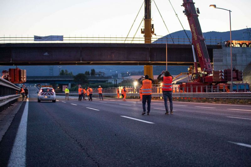 The most important and difficult part was the transport of the single steel span across the two carriageways of the motorway, plus the lane of the rest area. This operation took place over two whole nights, during which the highway was closed to traffic. In this case, my team and I were able to film all the long and delicate phases in detail.